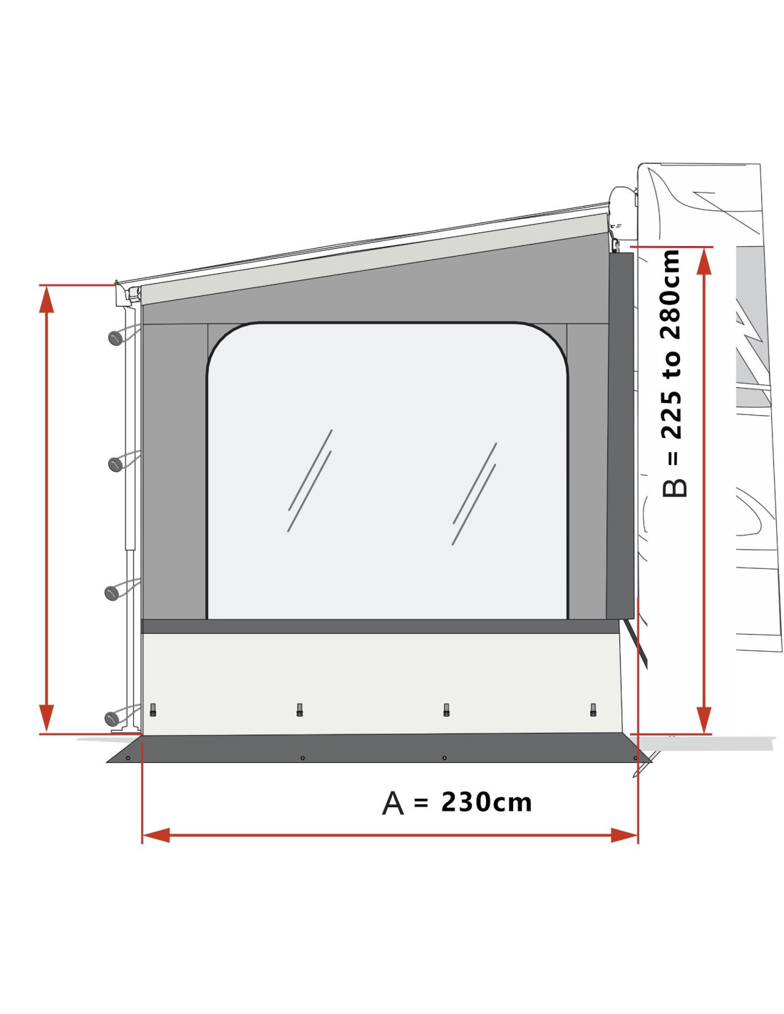 Painel lateral de altura total com janela e saia de lama para montagem em toldos Fiamma F45, F70 e F65 / F80 com extensão de 250cm e instalados em alturas entre 225cm - 280cm. O Fiamma Side W Pro - F45 / F80 adapta-se aos toldos Fiamma F45 com projeção de 250cm da autocaravana e pode acomodar toldos Fiamma F65S e F80S se adquirir o suporte de fixação adicional.