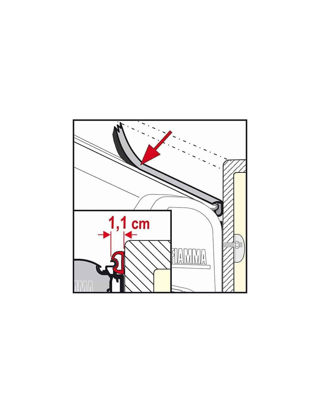 Borracha protectora, conveniente para selar o espaço entre o toldo Fiamma e a parede do veículo, para impedir a infiltração de água, instalado na caixa, sem necessitar remover o toldo. Rain Guard S; Para toldos instalados com suportes padrão AS 120(adaptadores comuns em F45S) no plano.