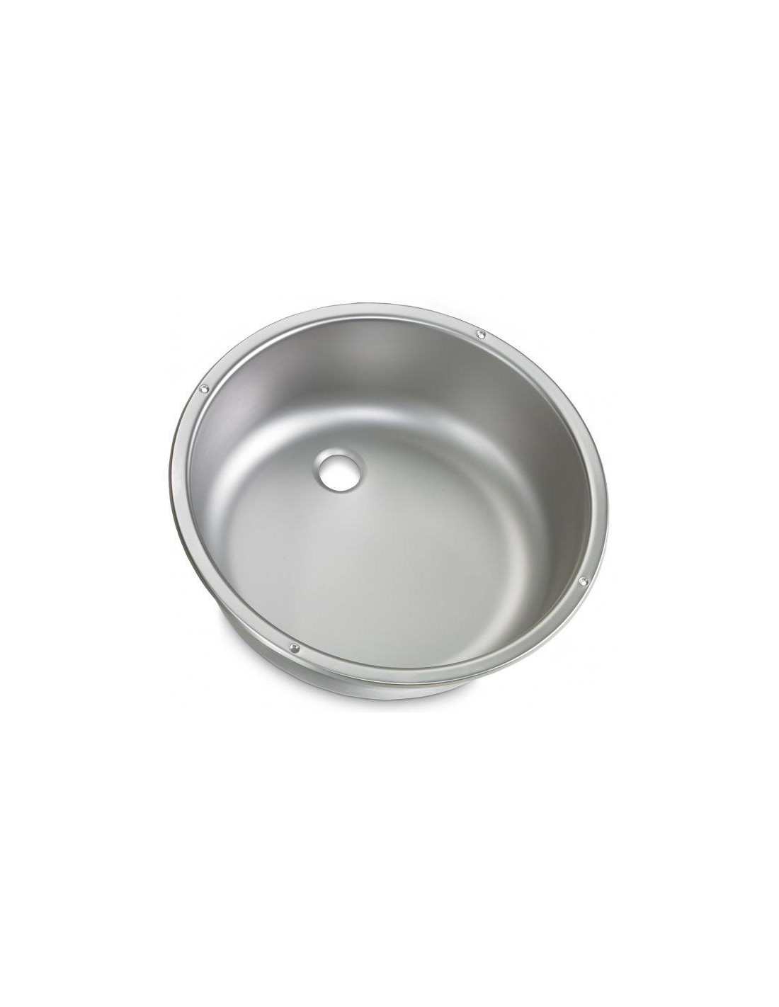 Este lava-louça redondo, fabricado em aço inoxidável, foi concebido para ser montado com as torneiras posicionadas no exterior da pia.