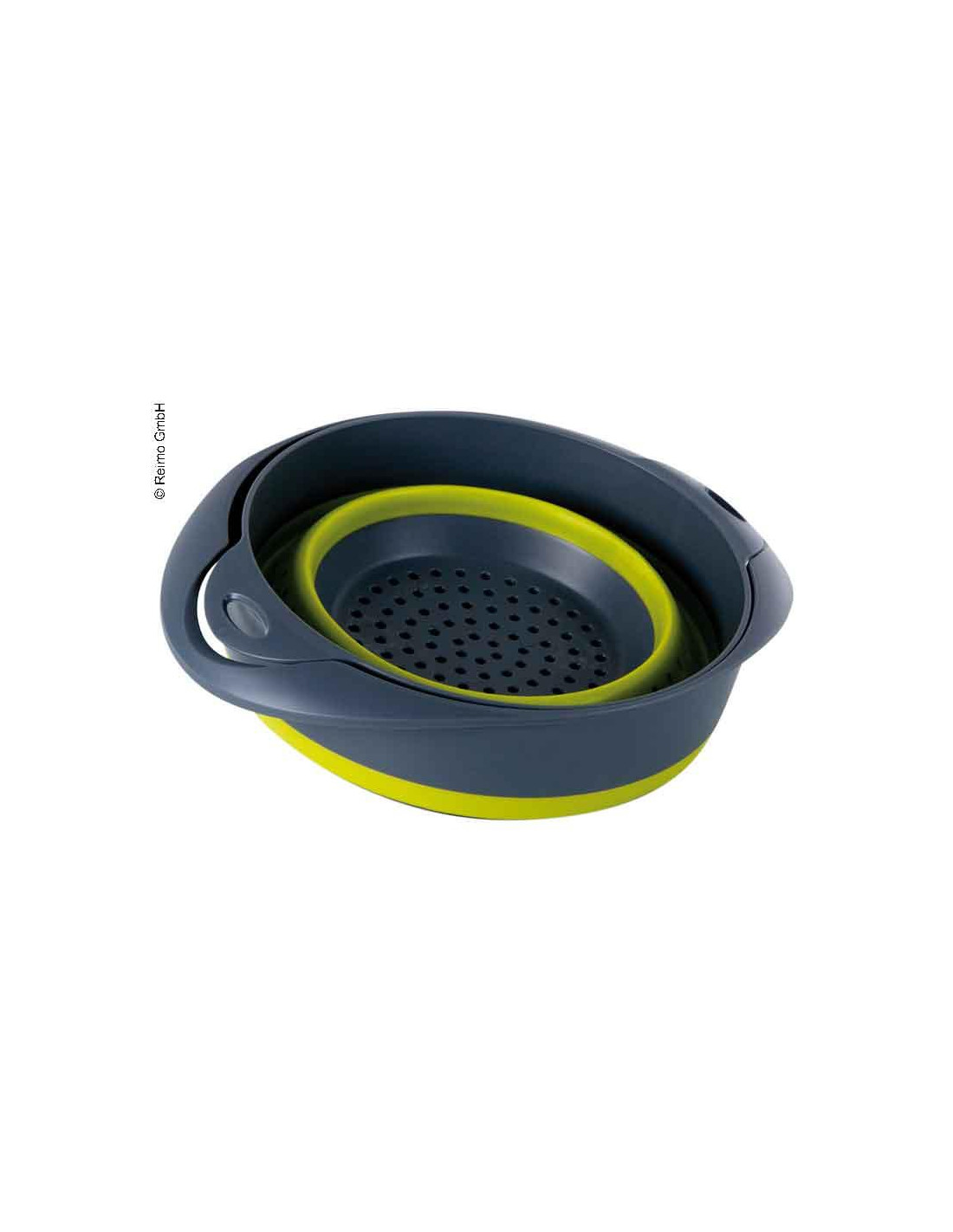 Tigela de silicone dobrável, incluindo filtro de silicone dobrável, cada um com 2 alças. Empilhados e dobrados juntos, a tigela com peneira pode ser guardada em um motorhome ou caravana para economizar espaço.