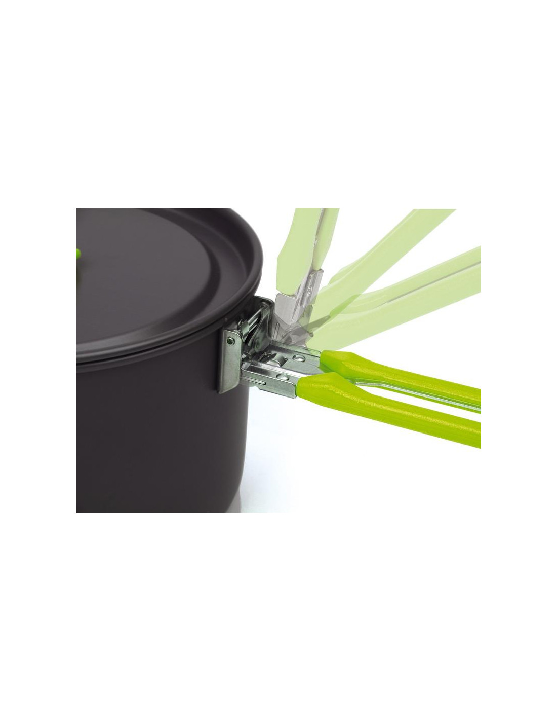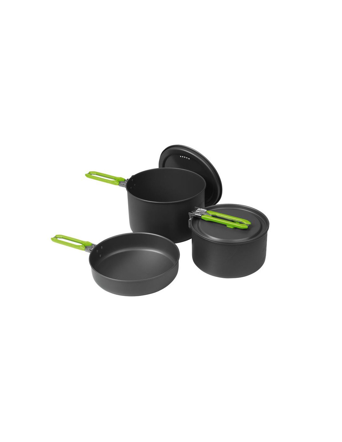 O conjunto de panelas Camp4 Elite é composto por 2 panelas com tampa e uma frigideira. Graças às alças dobráveis, o conjunto de panelas pode ser guardado para economizar espaço. Ideal para campistas de van com espaço limitado. Com bolsa de transporte para armazenamento.