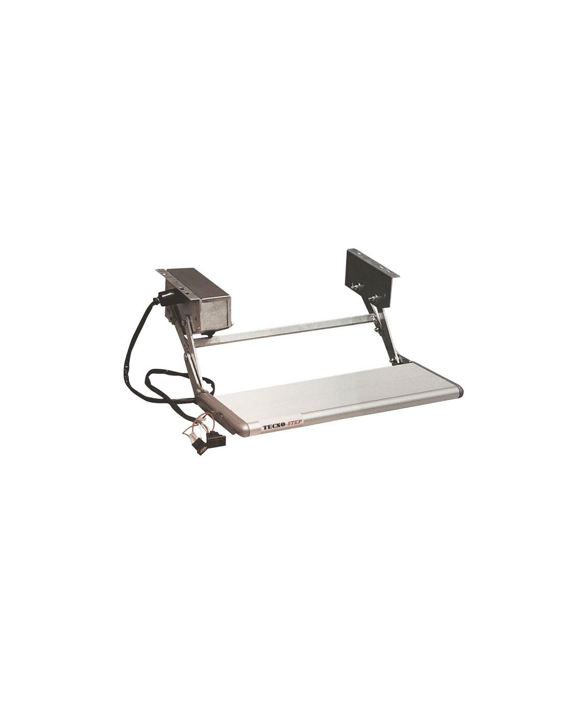 Degrau elétrico inteiramente em aço galvanizado a quente, equipado com uma confortável plataforma de escalada em perfil de alumínio anodizado prateado completo com proteções laterais resistentes a impactos.