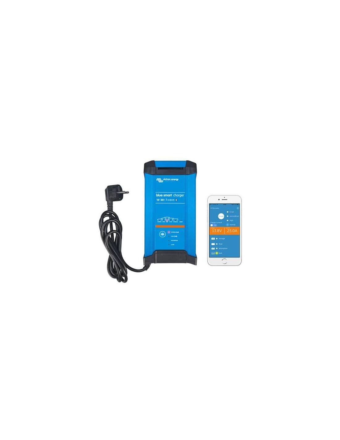 O carregador Victron Blue Smart IP22 12/20 (1) possui gerenciamento de bateria "adaptativo" controlado por um microprocessador. Sua função “adaptativa” otimizará automaticamente o processo de carregamento com base no uso da bateria.