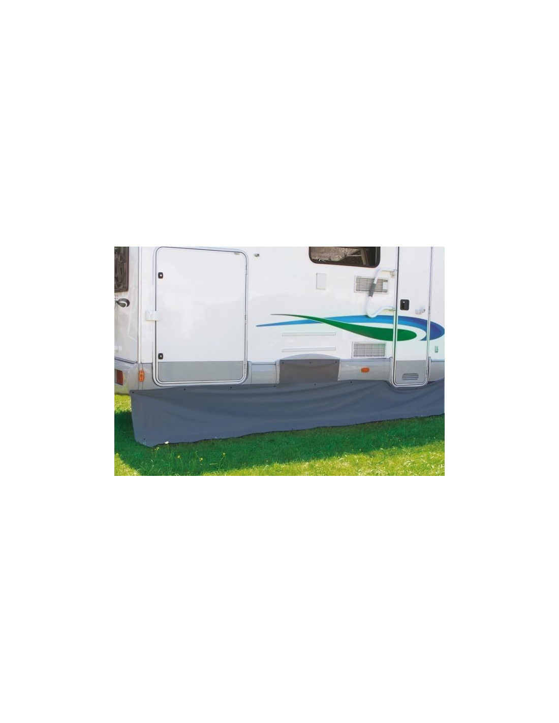 O Rodapé Fiamma Motorhome mede 550 cm de comprimento e 60 cm de altura e o material que não desfia pode ser cortado para se adequar a toldos menores. Fornecido com tampa de arco de roda ÚNICA com 75cm de diâmetro.
