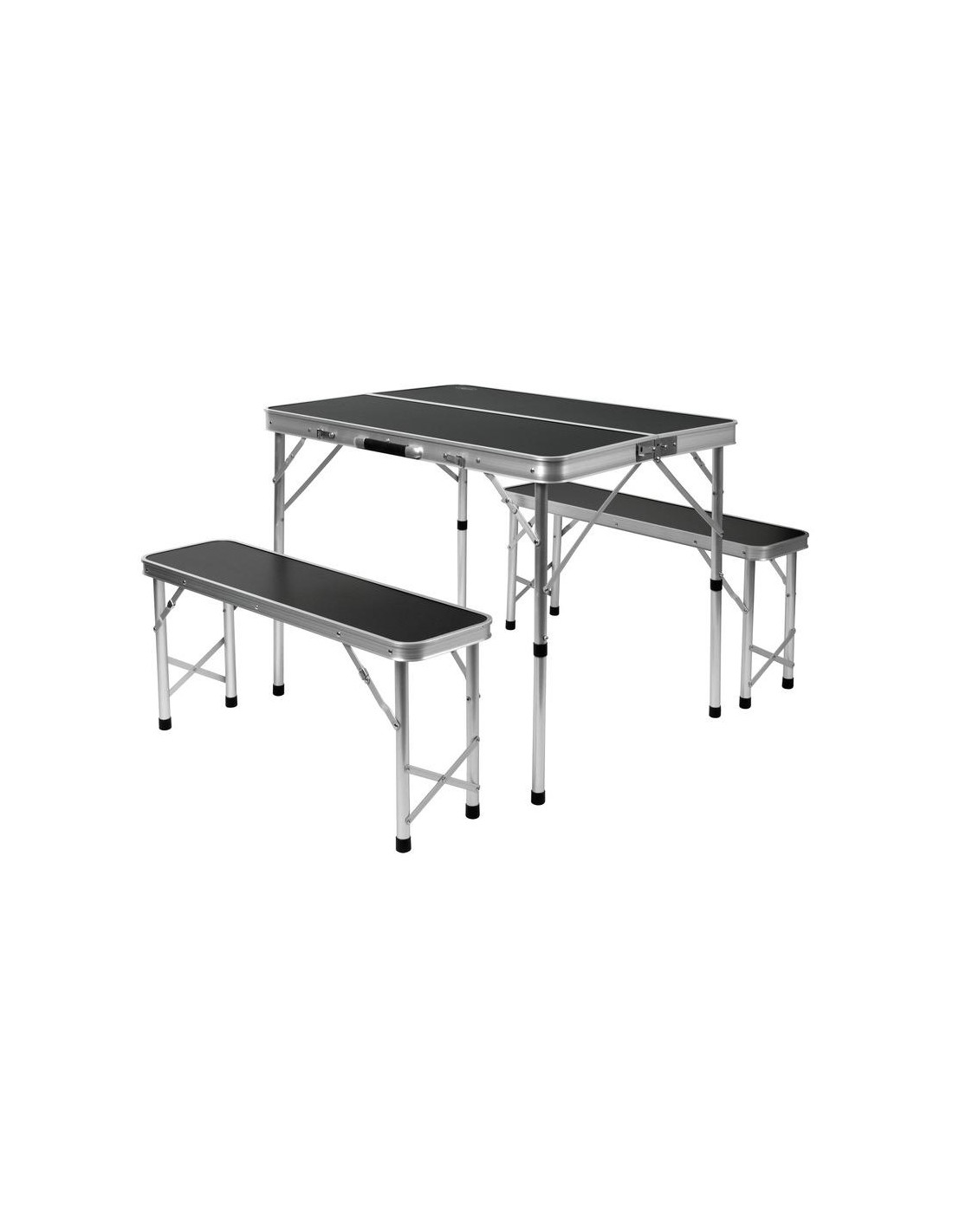 O grupo de assentos com mesa e 2 bancos é simplesmente dobrado como uma mala depois de os bancos terem sido arrumados na mesa. O tampo da mesa e o banco corrido em MDF em um elegante visual preto fazem brilhar seus talheres coloridos de piquenique e camping. Perfeito para 2-4 pessoas.