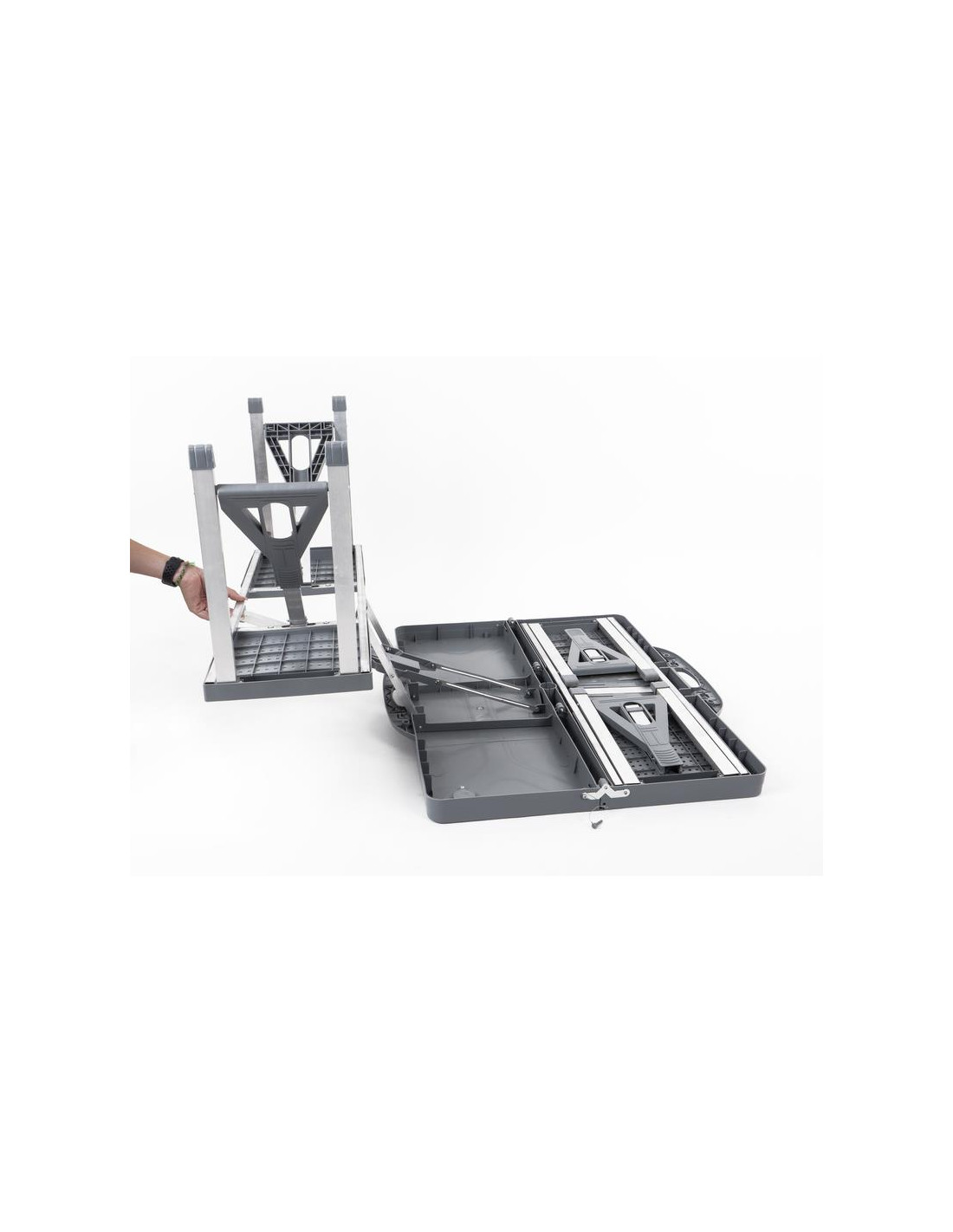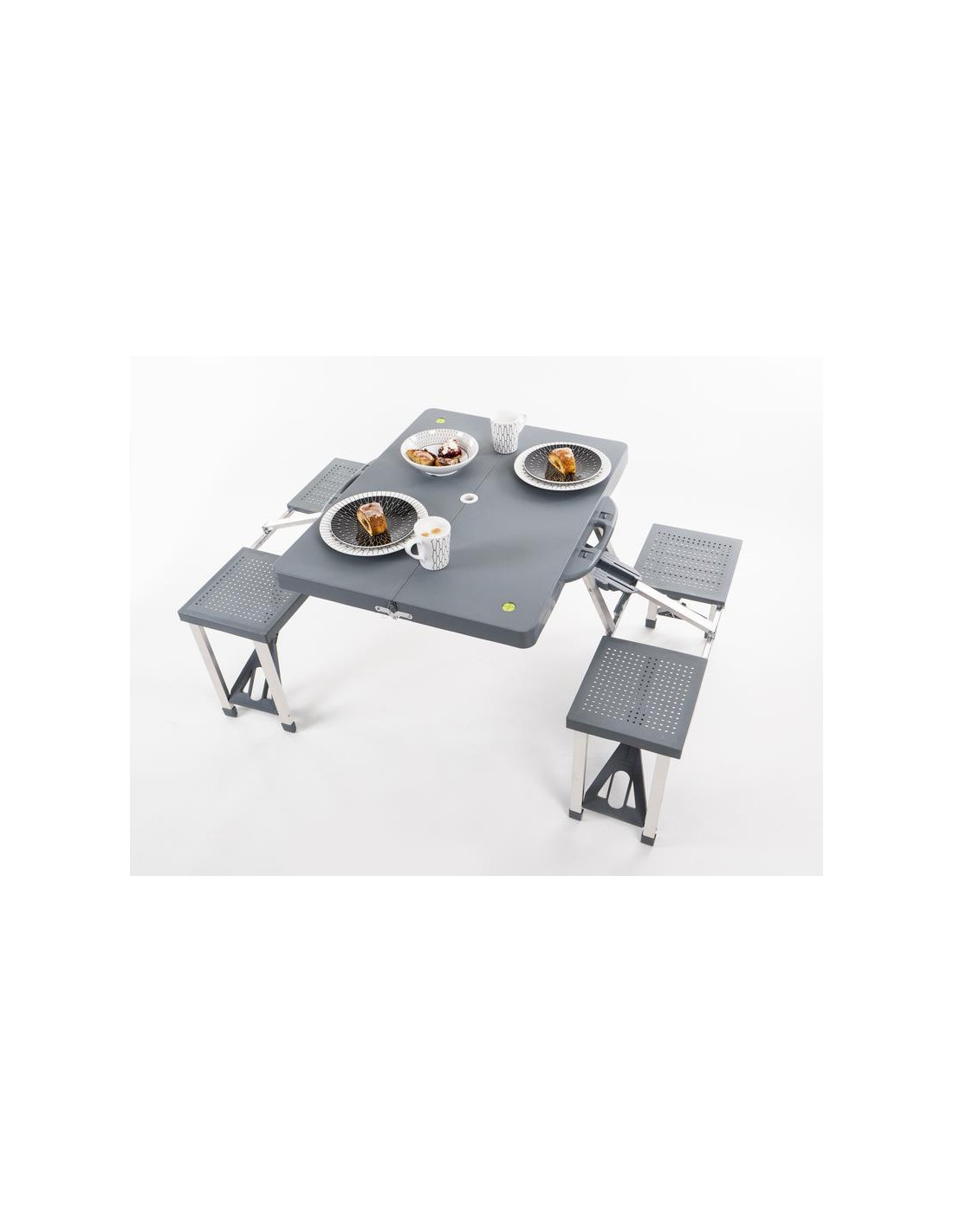 A mesa de piquenique pode ser montada rapidamente e possui 4 assentos instalados permanentemente, cada um com capacidade para no máximo 60kg. A mesa dobra-se ao meio formando uma mala com uma prática pega de transporte e por isso é fácil de transportar. A mesa tem um orifício para guarda-chuva no meio - para chuva ou guarda-sol... O tampo da mesa é de plástico (PP) e a moldura é de alumínio.