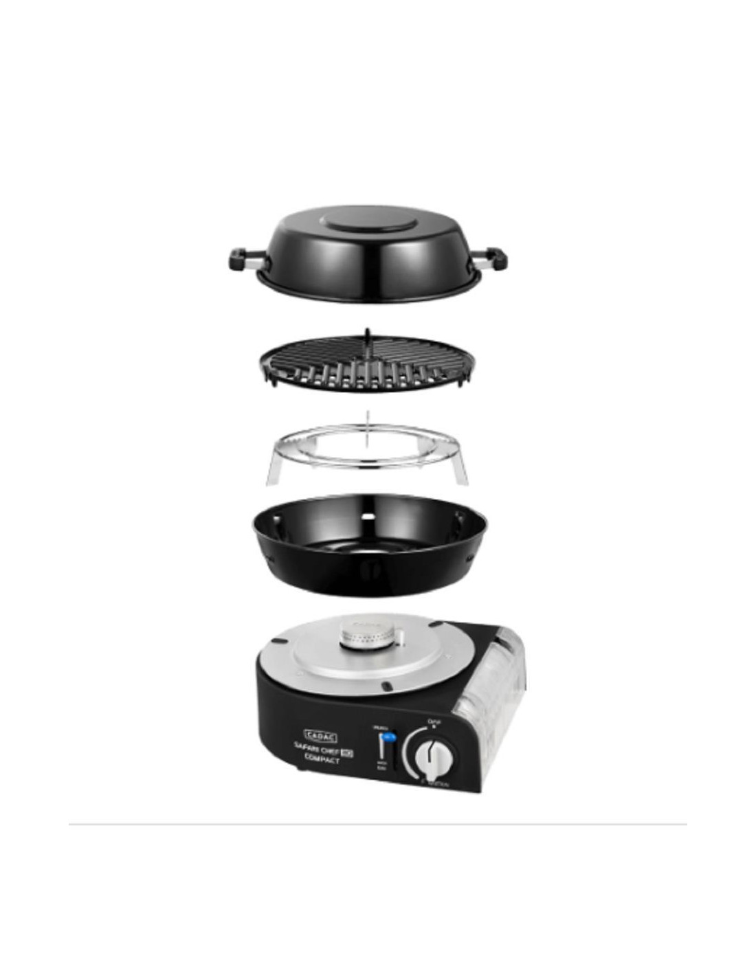 Apesar do seu pequeno tamanho, o Safari Chef Compact é extremamente versátil devido aos vários topos de cozinha incluídos; um suporte para panelas, grelha para churrasco e panela/tampa. Use o suporte para panelas para cozinhar uma panela de sopa ou macarrão. A grelha para churrasco possui revestimento GreenGrill da CADAC e é perfeita para assar e grelhar carne, peixe e vegetais. A tampa também pode ser usada como panela e por isso é multifuncional.