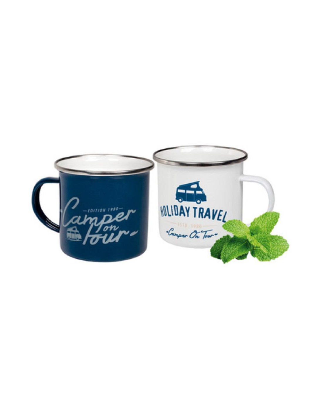 2 canecas esmaltadas da série HOLIDAY TRAVEL nas cores azul com estampa CAMPER ON TOUR e branca com estampa HOLIDAY TRAVEL (impressas em ambos os lados).