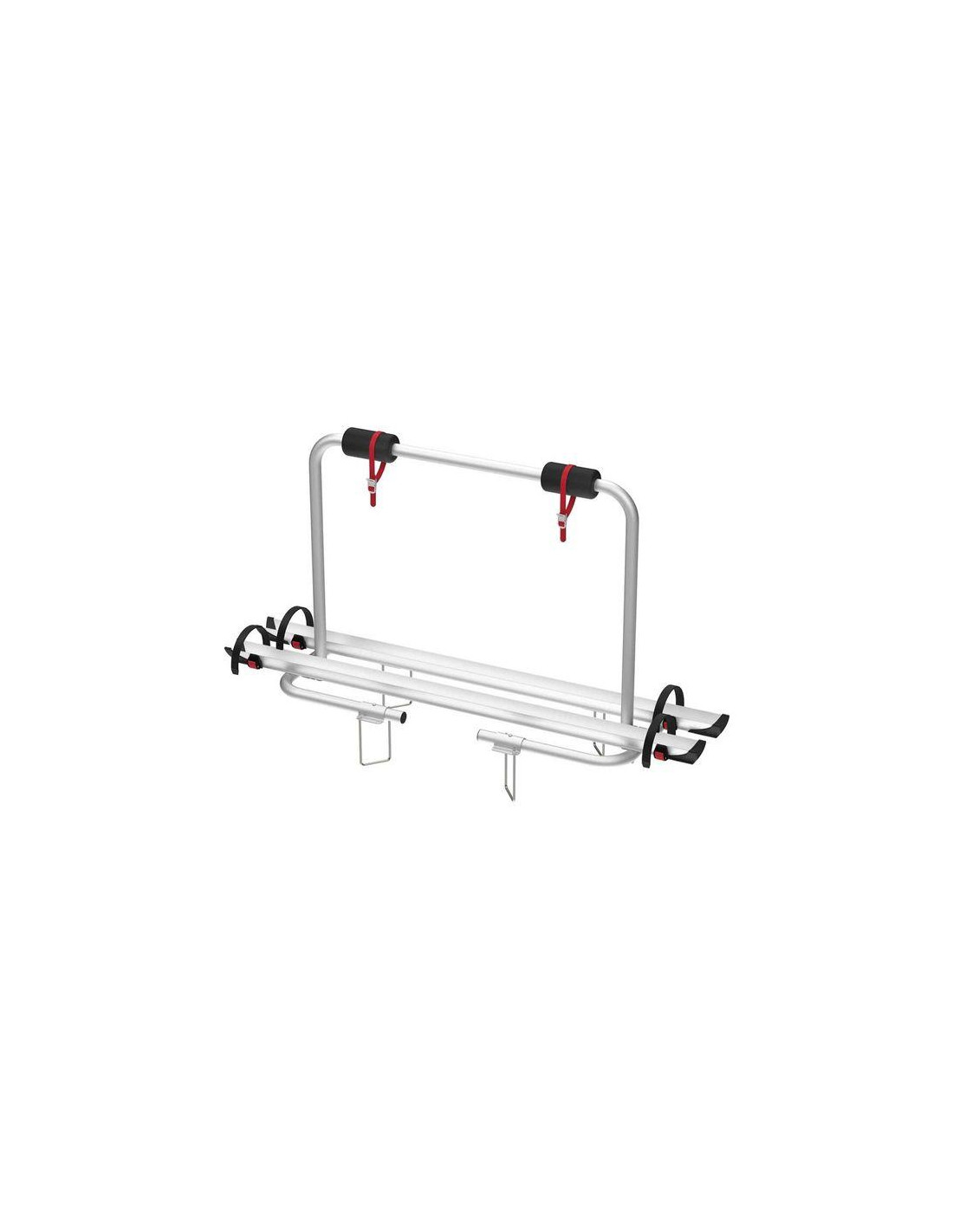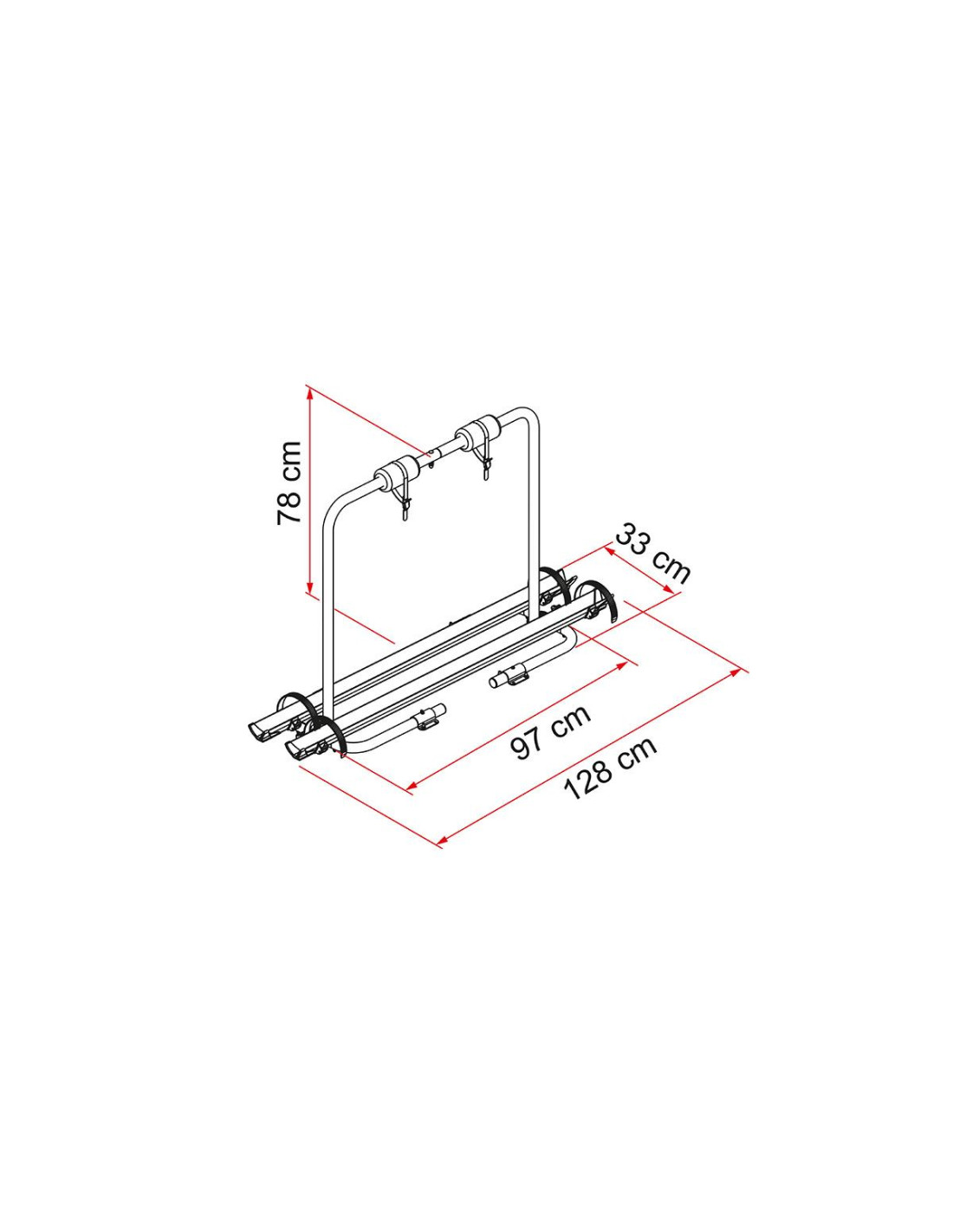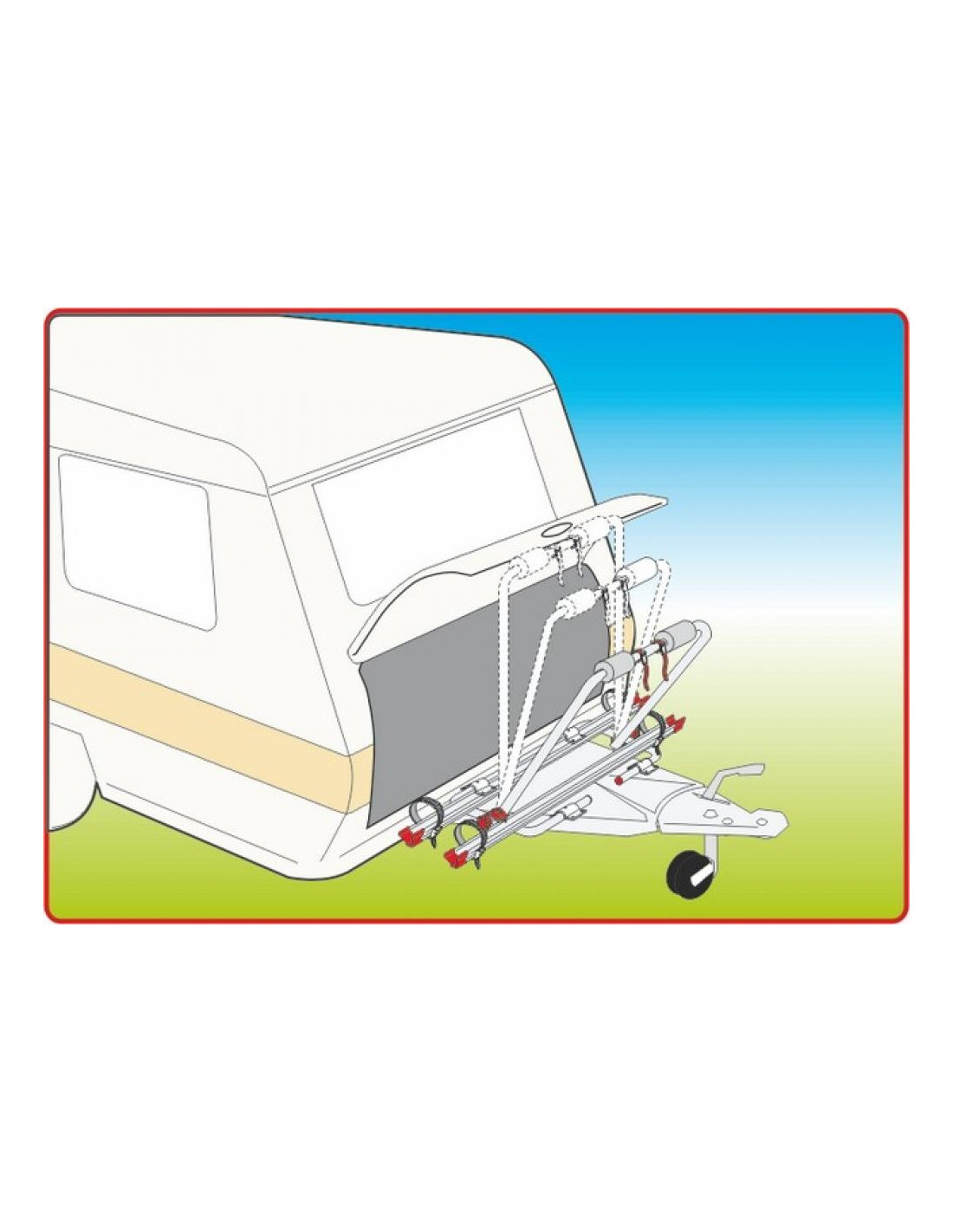 O porta-bicicletas transporta duas bicicletas e a estrutura superior do porta-bicicletas gira para a frente permitindo o acesso ao compartimento de arrumação da caravana (quando as bicicletas não estão montadas)