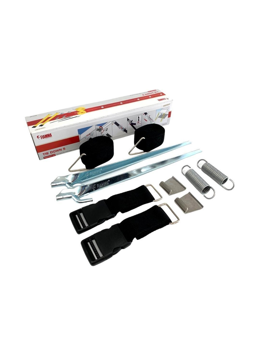 O conjunto de fixação TIE DOWN S Fiamma é recomendado para toldos de autocaravanas, caravanas e camionetas. Torna o toldo mais estável em condições de vento. É montado no painel frontal dos toldos F45S, F45L, F65S, F65L e dos toldos Fiamma Privacy Room que se adaptam a estes toldos.